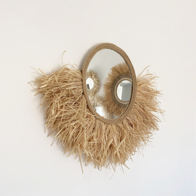 Partint d’un mirall rodó, la decoració feta a partir de ràfia natural, s’ha dissenyat de forma semicircular, per donar dinamisme a la peça. Podràs col·locar el teu mirall de la manera que més t’agradi, vertical, horitzontal o si ets dels més atrevits, en diagonal. Fins i tot pots arribar a combinar diferents peces, creant una escultura única a la teva paret.